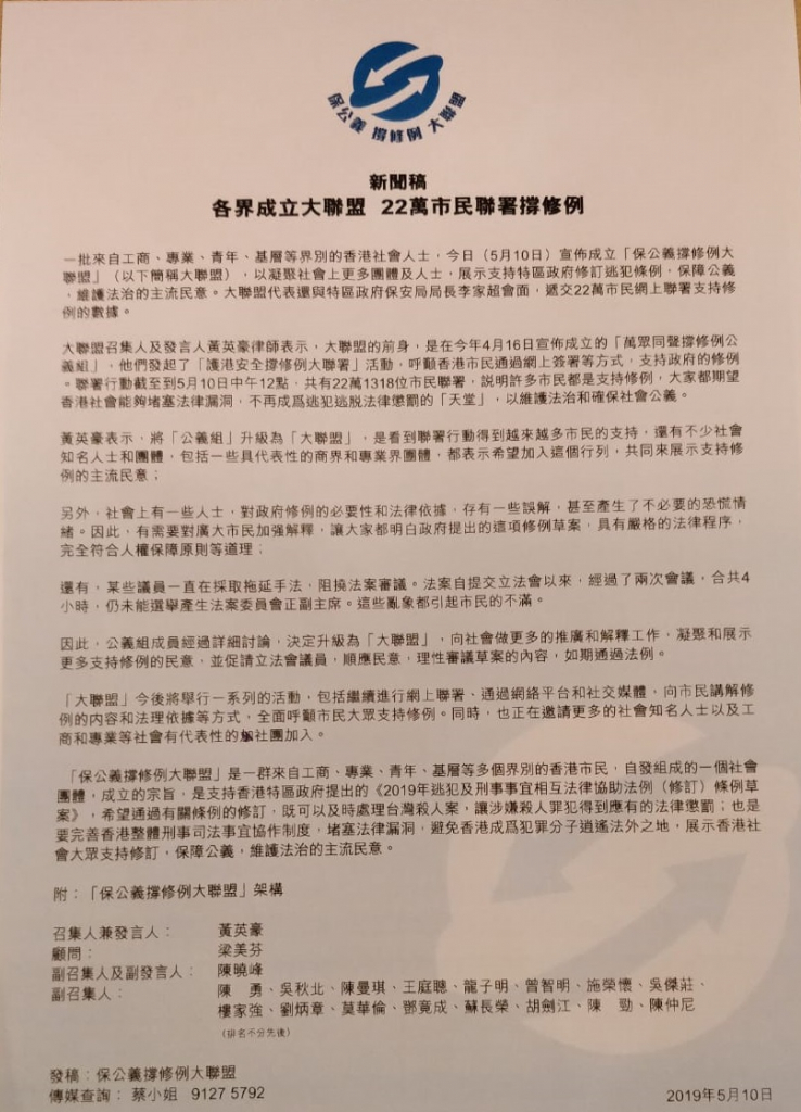 一批來自工商、專業、青年、基層等界別的香港社會人士,今日宣佈成立「保公義撐修例大聯盟」(以下簡稱大聯盟),以凝聚社會上更多團體及人士,展示支持港府修訂逃犯條例的主流民意!