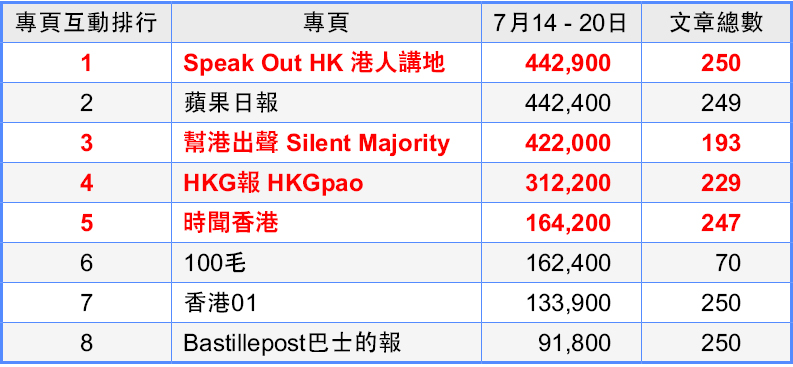 本報觀測由2017年7月14日梁國雄、劉小麗、姚松炎、羅冠聰四名立法會議員被法庭DQ當日,截至該月20日期間,香港各大傳媒Facebook專頁的參與互動人數(engagement),詳見下表: