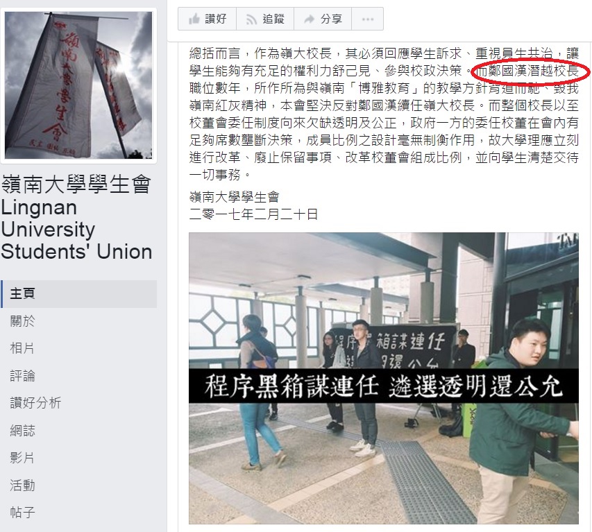 【HKG訊】嶺南大學校長鄭國漢的任期將於明年屆滿,嶺大校董會今午舉行會議,議程包括討論校長續任事宜。嶺大學生會指,校董會內唯一學生代表、學生會會長鄭沛倫日前獲校方告知,按大學條例,今日校董會會議討論校長任命時須避席離場,學生會質疑嶺大事前未有就討論鄭國漢的續任問題舉行諮議會。嶺大學生會在校董會會議開始前請願,表達對校長委任程序的訴求,並在聲明中表示「鄭國漢『潛越』(應為「僭越」之誤)校長職位數年」,「本會堅決反對鄭國漢續任嶺大校長」。