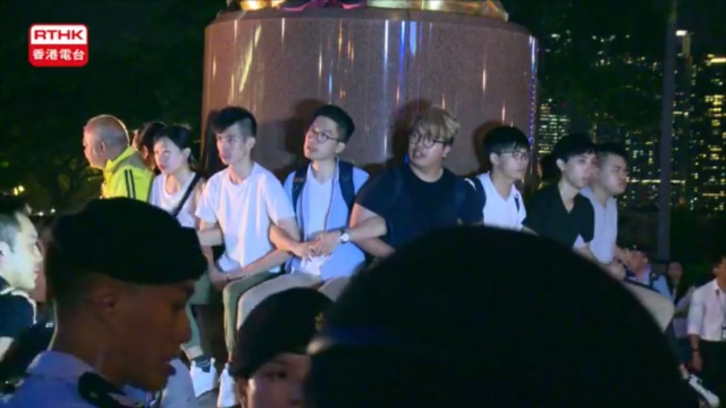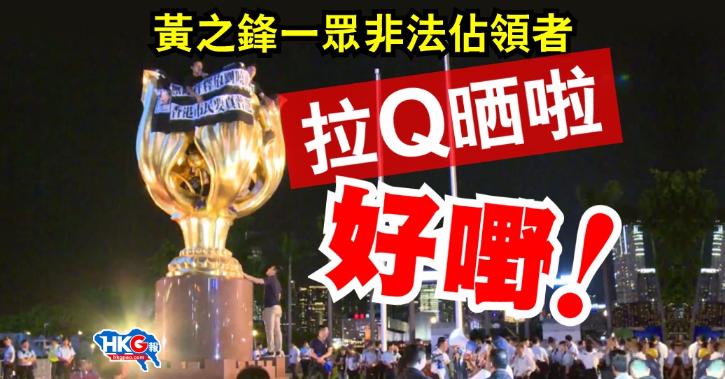 河童今日下午再率眾搗亂金紫荊廣場,既呼籲支持者一同「留守」又聲言「堅決留守」到國家主席習近平明日來港,大有再發動違法佔中之勢。搞笑的是,不足數個小時,一隻二隻便乖乖束手就擒,結束了一場無聊的鬧劇,一干人等亦被警方以「公眾妨擾罪」拘捕。 下午,包括香港眾志「河童」黃之鋒、羅冠聰;社民連「長毛」梁國雄、「阿牛」曾健成、黃浩銘;人民力量「快必」譚得志等26名激進派人士再次突襲金紫荊廣場。他們在雕塑下圍坐,並在雕塑掛上黑色標語,上書「無條件釋放劉曉波」、「香港市民要真普選」。部分人甚至一度以鐵鏈圍腰,好像要明死志一樣,期後卻又淆底解下。