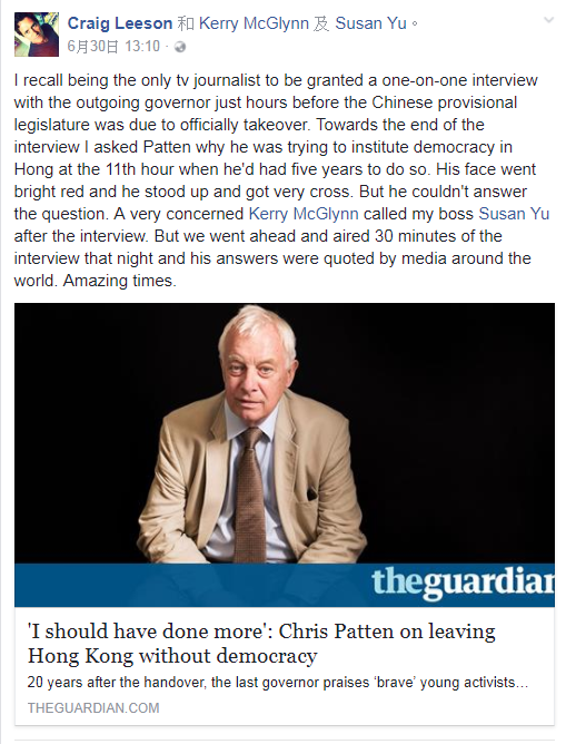 這則在Craig Leeson私人Facebook發表的帖子截圖在新聞界圈子流傳並引起討論,帖文是Craig憶述自己在回歸前幾小時是惟一親身一對一訪問彭定康的記者。他問了彭一個尖銳的問題:為何你在香港有整整五年任期不做,但在上任最後階段才決定推行民主?(I asked Patten why he was trying to institute democracy in Hong at the 11th hour when he'd had five years to do so.)