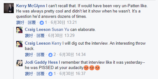 有趣的是,Kerry McGlynn 在Craig帖子下留言(見下圖)說自己印象中沒有經歷此事。而Craig則回應可找前上司Susan作證,還說自己已找出當年的訪問片段。然後,更引來另一名知情人士Jodi Gaddy Hess留言證實此事,更說肥彭因為Leeson 的大膽發問而非常憤怒。