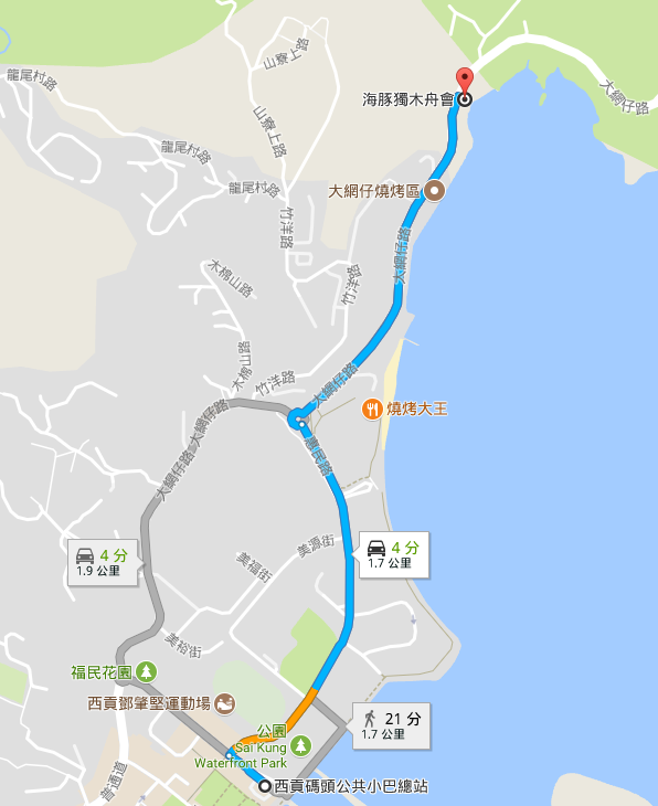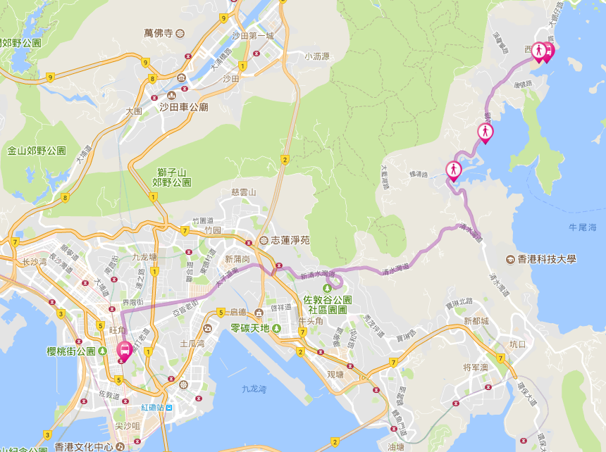 小巴由廣華醫院門外開出,經彌敦道、窩打老道、太子道東、清水灣道、西貢公路至西貢碼頭小巴總站,全程需時約三十多分鐘,收費為$17元(如下圖示):