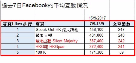 上圖顯示2017年9月7日至13日,即9月的第二個星期,香港幾家主要網媒的Facebook專頁engagement互動數字,即該星期內所有post的表態、留言加轉載總量。